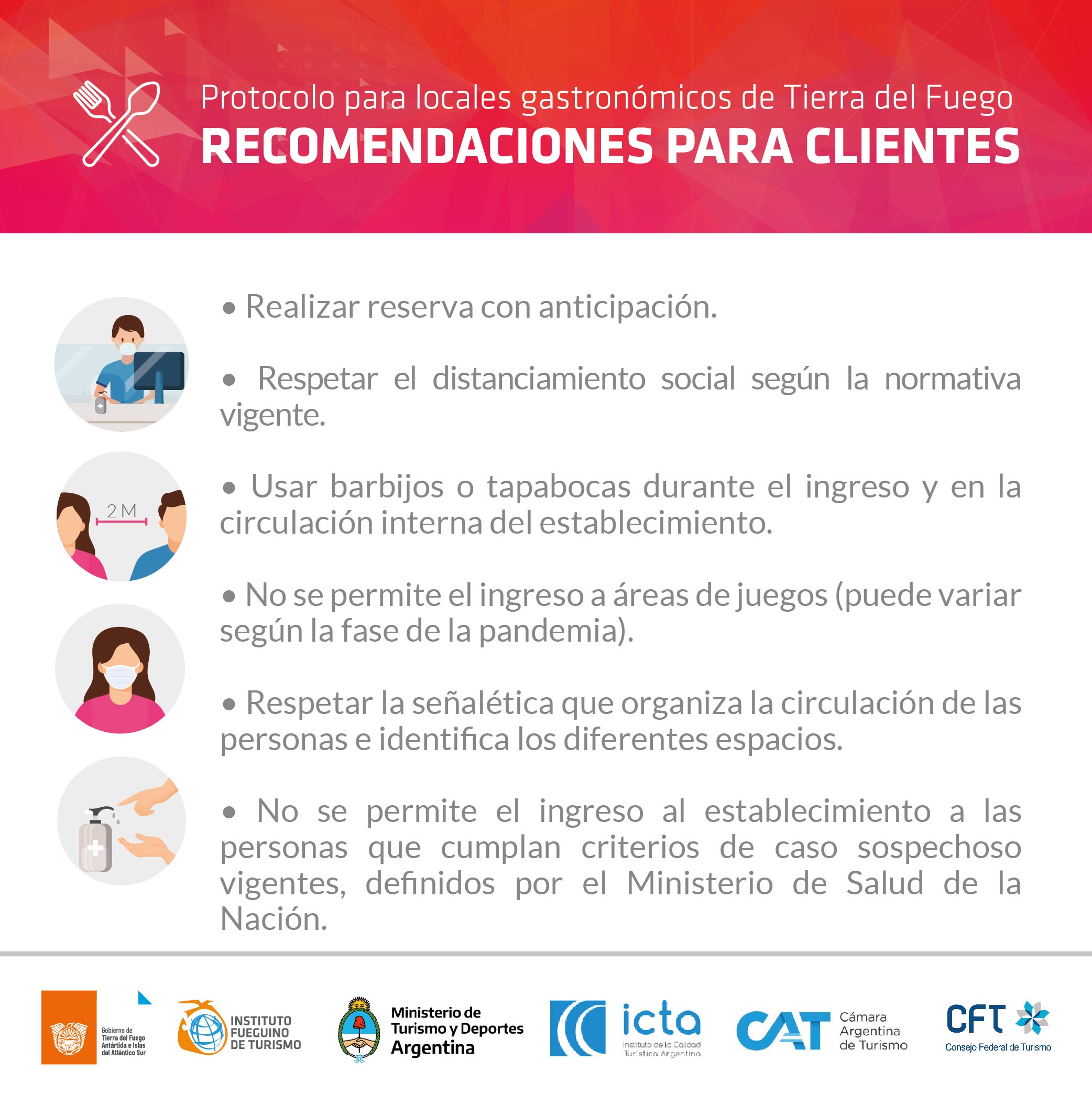 Protocolo: Establece medidas generales sobre higiene y salubridad, como así también lo relacionado al servicio de restaurante, con recomendaciones para el personal, zonas de circulación, mobiliario, salón y cocina.